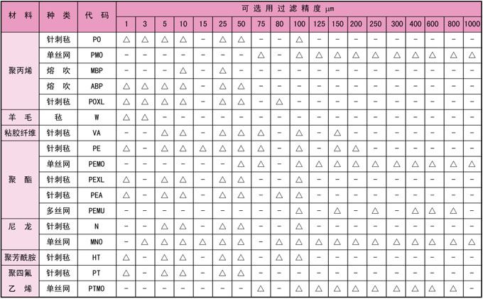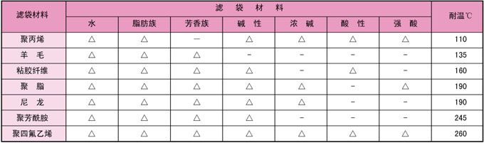 滤袋是袋式精细过滤器的核心件。我公司提供的高品质滤袋是您完美、一致性过滤的保证。构成滤袋的纤维材料有聚丙烯、聚酯、聚四氟乙烯、聚芳酰胺、尼龙、羊毛等,过滤精度1-1000μm,选用时应根据不同介质,抗化学性能及耐温来确定。详见下表: