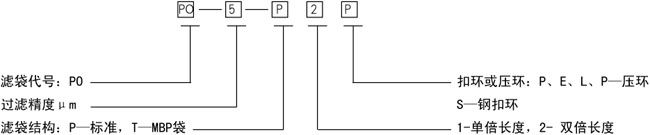 示例:PO-5-P2P表示标准型5μm聚丙烯针刺毡滤袋,双倍长度,聚丙烯压环。