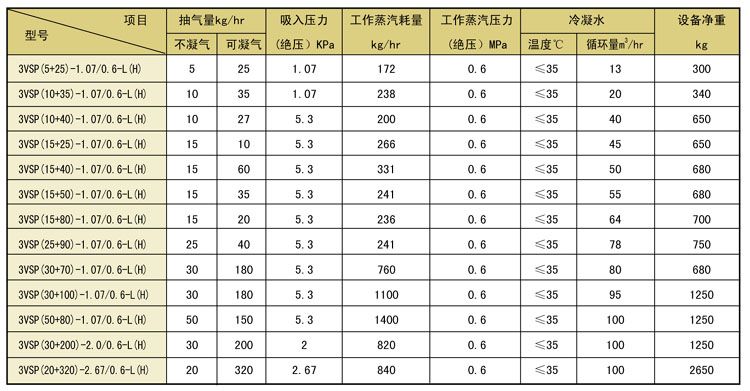 产品展示 更多产品分类 过滤设备 静态混合设备 加热设备系列 动态混合设备 消声器 纸张专用设备 管用专用小型设备 油罐附件系列 煤气管道排水器 3SP系列三级蒸汽喷射真空泵 一、技术参数 二、订货说明 1、许可工作蒸汽最低压力为0.3M P a( 绝压),请用户在订货时说明,以便我们根据用户的实际工作蒸汽压力配制喷射嘴。 2、图示冷却凝为混合式,我们可以根据用户要求配制列管式冷凝器。 三、应用场合 1、粘胶纤维真空脱泡 2、植物油脂脱色、脱臭 3、真空浸渍 4、喷射制冷 5、化纤切片干燥 6、化学单体回收 7、烟叶真空回潮 8、甘油蒸馏 9、浓缩结晶 已是第一页下页
