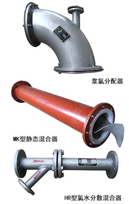 HR型氯水分散混合器①是采用喷射器技术的小型设备,喷射水流的冲击将负压吸入的氯气粉碎分散成微细气泡,然后混合溶解于水中,生成基本均质的氯水混合物,再通过浆氯分配器②的中和,与浆料一起进入MK型静态混合器③进入快速混合。