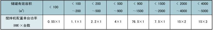 搅拌机的选用与介质的性质、油罐的容积、搅拌的目的、操作的目的、操作条件等有关。因此,在选用搅拌机前首先必须确定这些条件,再根据这些条件确定搅拌机的型式和功率。1、固定插入角型搅拌机的功率按下表选用