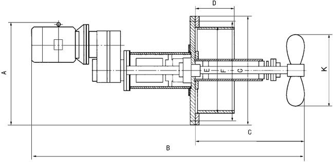 侧向伸入式搅拌机是由储罐的侧壁伸入罐内,它通过法兰盖与罐体的开口法兰相联结。搅拌机的桨叶为船用螺旋桨型。由于螺旋桨的转动,使罐内液体产生两个方向的运动,一个沿着螺旋桨轴线方向向前运动,另一个沿螺旋桨圆周方向的运动。轴线方向的运动,由于受到罐壁的阻碍而使罐内液体沿着罐壁作圆周方向的运动,而液体沿螺旋桨圆周方向的运动,就使罐内液体上下翻动,这样就使罐内液体得到搅拌,并可防止罐内沉积物的堆积。