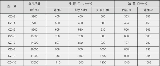 产品展示 更多产品分类 过滤设备 静态混合设备 加热设备系列 动态混合设备 消声器 纸张专用设备 管用专用小型设备 油罐附件系列 煤气管道排水器 CZ型轴流风机消声器 一、结构形式 CZ型轴流风机消声器 二、适用范围 主要用于降低各种室内进排风、矿井通风用轴流风机的空气动力性噪声。消声量≥12d B(A),压力损失≤50Pa 三、规格、性能、外形尺寸CZ型轴流风机消声器 上页下页