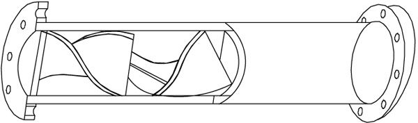 SKL型浆氯静态混合器是一种管式装置,它由混合元件和管体组成。混合元件呈螺旋形,它由多组扭曲成180度的左旋、右旋交叉排列的螺旋板(工业纯钛TA2)焊接而成。