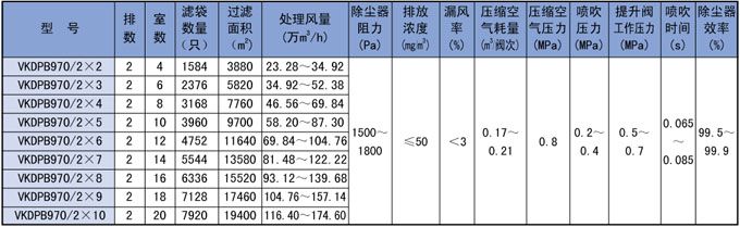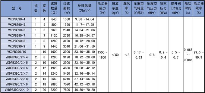 JLLPB型低压脉冲喷吹袋式除尘器入口浓度不宜超过15g/Nm3,对颗粒大的含尘气体可酌情放宽。若入口浓度超过15g/Nm3,则需在除尘器前设置一级除尘设备,如旋风除尘等。七、设备性能参数