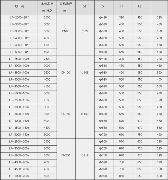 表五、水封高度>7000mmH2O高压防泄漏型煤气排水器外形尺寸