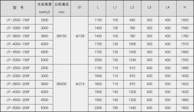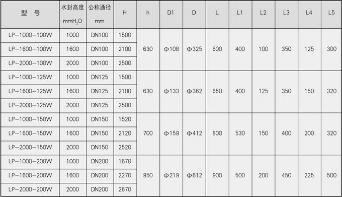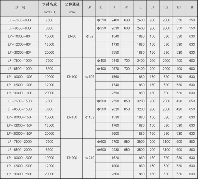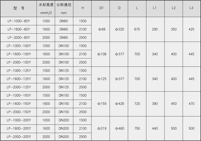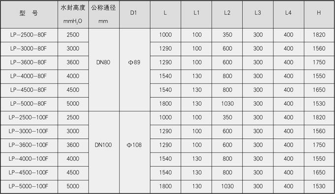 表一、水封高度≤2000mmH2O防泄漏型卧式煤气排水器外形尺寸